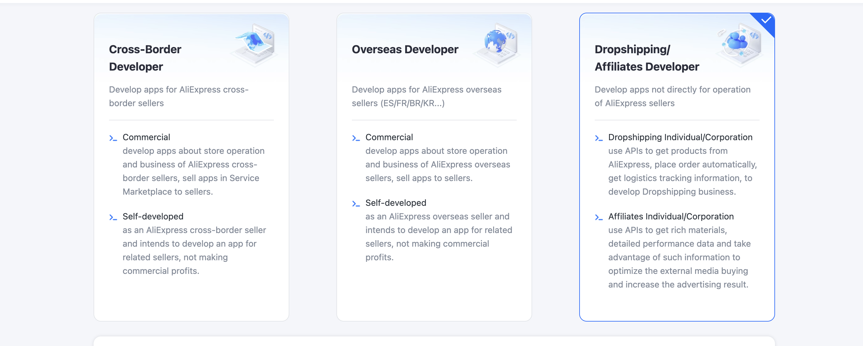 Durante el registro puede que se te pida el tipo de desarrollador: selecciona "Dropshipping / Affiliates Developer" (la última opción a la derecha).